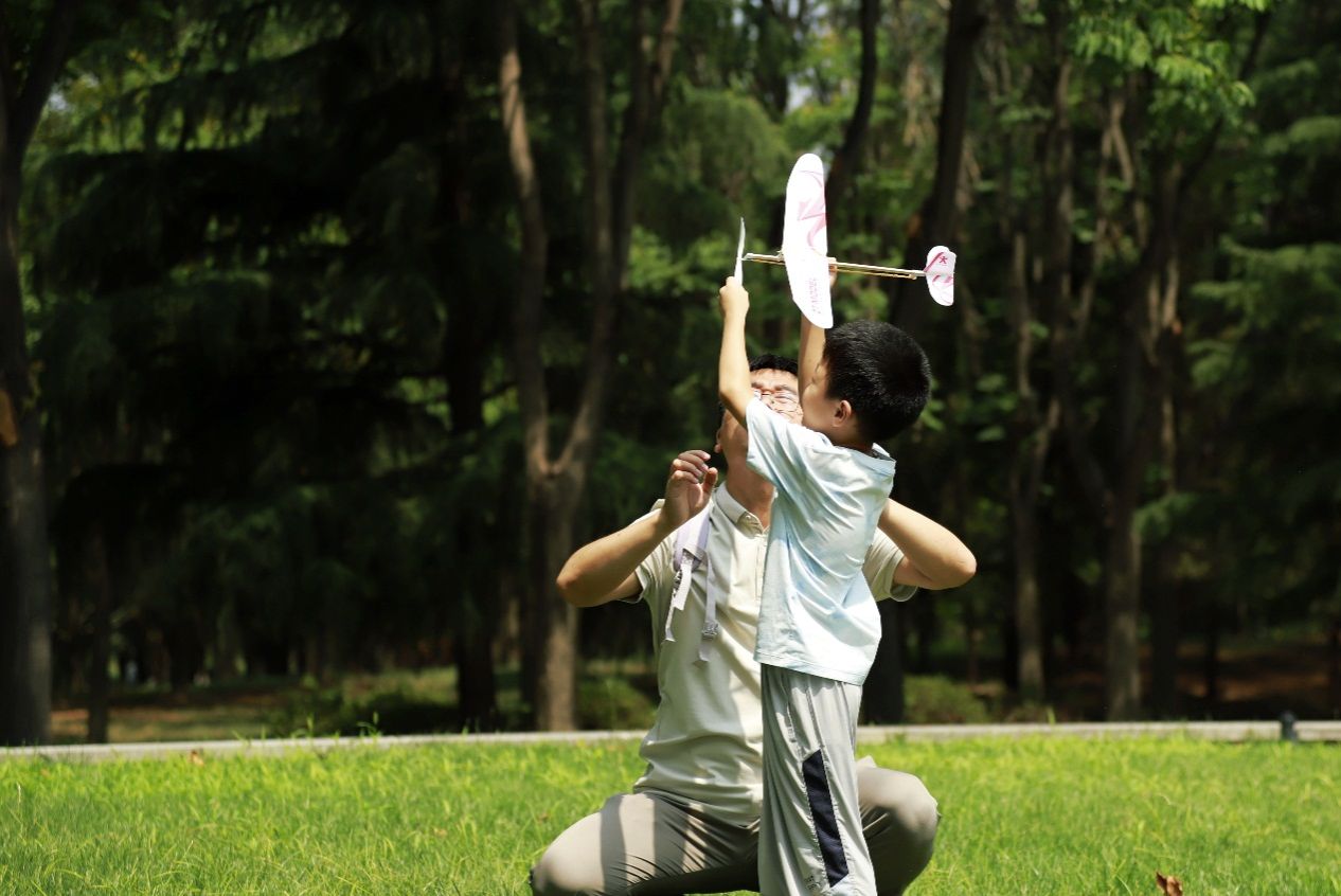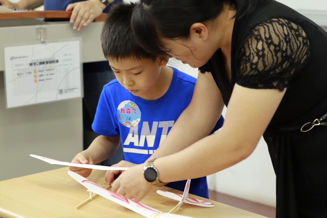 10:30的航模表演将活动推向高潮,信天翁俱乐部呈现的特技飞行引起在场家长和小朋友发出阵阵惊叹。随后的飞行训练中,家长与孩子共同调试飞机重心和橡筋扭矩,亲子协作解决“飞机偏航”等实际问题。11:25举行的“耐力飞行赛”中,丁冠焜同学组装的飞机以最长滞空时间夺冠。