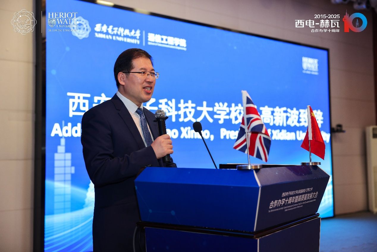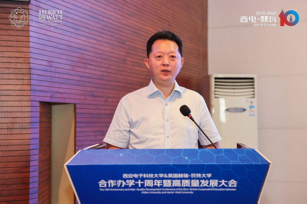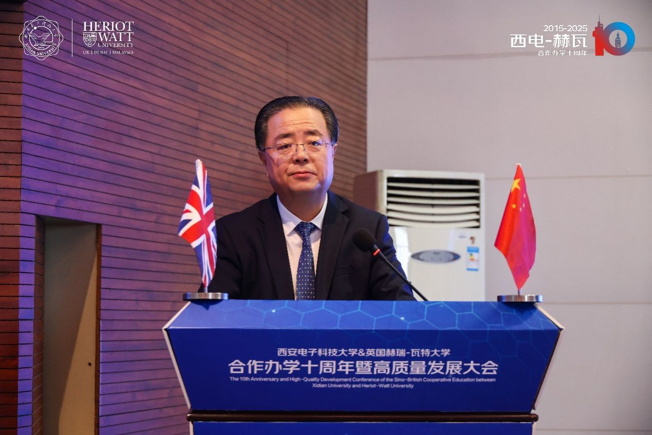 (通讯员 薛喆 王思阳)十年春华秋实,一路融贯东西。9月15日,西安电子科技大学与英国赫瑞-瓦特大学合作办学十周年暨高质量发展大会在北校区老科技楼报告厅举办。西安电子科技大学校长高新波,赫瑞-瓦特大学校长理查德·威廉姆斯,中共陕西省委教育工作委员会副书记、一级巡视员王海波,陕西省人民政府外事办公室副主任黄勇,英国驻华大使馆苏格兰政府办公室主管柯春娜出席大会并致辞。会议由国际合作与交流部部长沈玉龙主持。