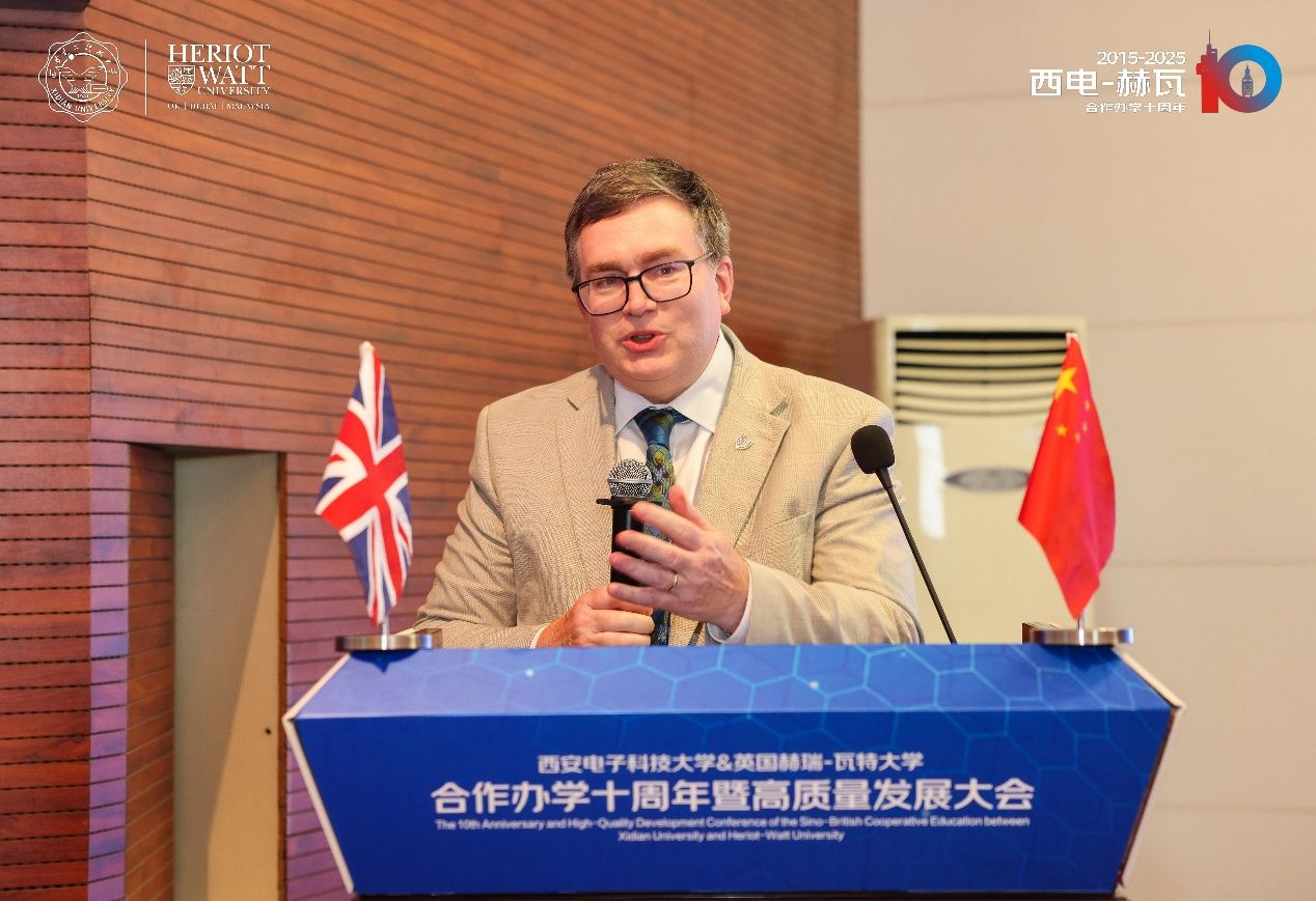 理查德·威廉姆斯介绍了十年来中英合作办学项目的育人成效,通过项目学位数据的提升、里程碑事件的见证等,回顾了两校合作办学历程,进一步传递双方围绕学生、重视学生的教育理念,希望赫瑞-瓦特与西电能够继续竭诚携手共进,开出更美的国际合作之花。