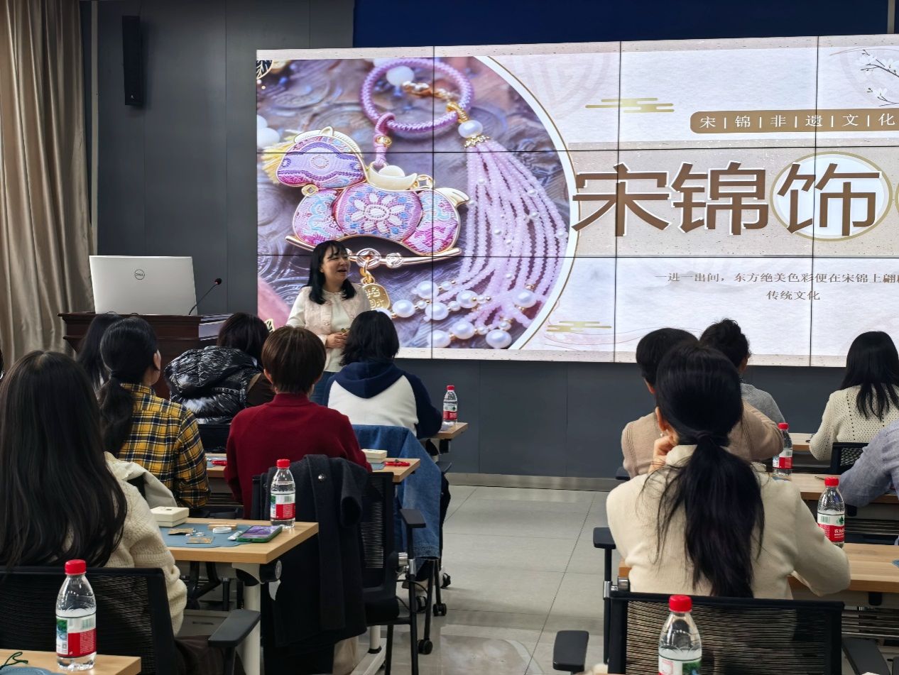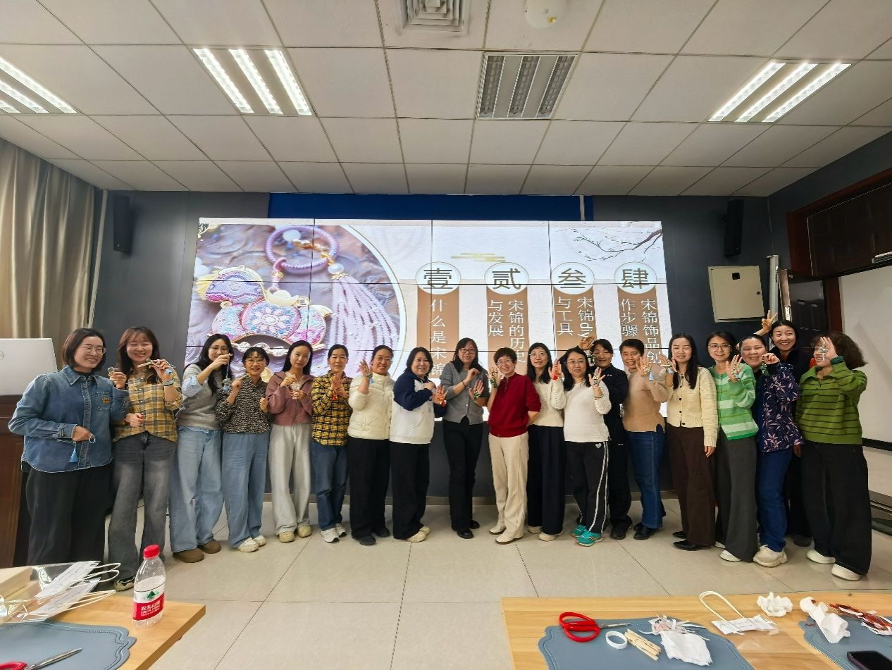 在主楼2区219室举办了一场别开生面的非遗手作体验活动。本次活动以“福马纳祥·宋锦车挂DIY”为主题,吸引了众多女教职工热情参与,在指尖流转的经纬间,共赴一场跨越千年的传统美学之约。