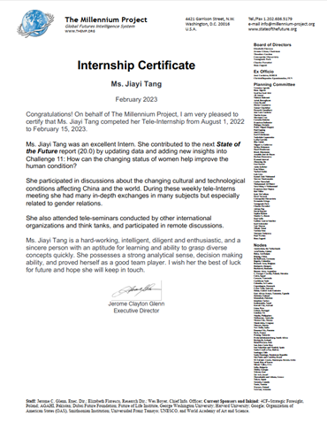 唐佳怡同学参与并顺利完成了The Millennium Project的实习,在实习中得到了主管的高度评价和同事们的一致认可,这是51吃瓜网