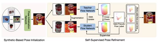 此外,团队的姿态估计新算法论文在ICCV 2023正式发表,论文一作为图像所硕士生海洋,导师为宋锐教授。该论文从利用自监督方法构建任务的角度出发,提出了一种仅使用RGB图像进行训练,不需要任何辅助信息的目标6D位姿估计方法。算法首先仅利用合成图像训练姿态估计网络获得初始姿态,然后在没有真值标注信息的真实图像上训练位姿优化网络。训练过程中,论文算法利用来自不同视角的图像对之间的几何一致性,动态地为位姿优化网络生成像素级的光流监督信号,最后通过获得的预测光流确定3d到2d对应关系,使用PnP求解器来计算最终姿态结果,实现基于自监督方法的目标级6D位姿估计。在LINEMOD, Occluded-LINEMOD,和YCB-V等数据集上的实验结果和可视化表明,论文提出的方法在真实数据集上有很好的泛化能力。