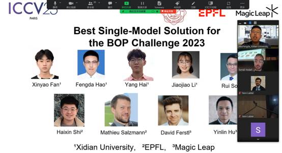 (通讯员 郝丰达)近日,两年一届的国际计算机视觉大会(IEEE International Conference on Computer Vision,简称ICCV)在法国巴黎举行。由西安电子科技大学,洛桑联邦理工学院(EPFL),和Magic Leap组成的联合队伍获得了此次会议举办的BOP Challenge(Benchmark for 6D Object Pose Estimation)中的单模型赛道冠军,同时获邀在8th International Workshop on Recovering 6D Object Pose(R6D)上汇报。