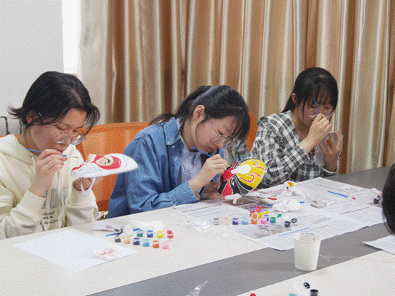 简要学习过脸谱绘画流程后,同学们可以根据自己喜欢的样式领取空白脸谱面具及水彩颜料进行绘画。现场学生专注、安静,以线条勾勒眉眼,以颜色填充面部,有的同学依照已有的样式临摹绘制,一笔一划细心谨慎;有的同学结合自己的理解与想象大胆创作,绘制出的脸谱生动有趣。在沉浸式动手绘制的过程中,学生更能体会到脸谱传承千年承载的意义,深刻领悟戏曲角色的性格特征与人生道义,极大程度激发了学生对传统文化的情感内化。